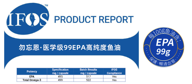 我国保健食品(蓝帽)对鱼油仅要求“EPA+DHA≥18 g/100 g”,且未强制要求EPA单成分指标。但心脑养护人群,实际对EPA的需求远超这一限定,高纯度EPA,临床获益更明确——《柳叶刀》子刊研究证实:单方EPA在降低心血管事件风险方面优于EPA+DHA的混合配方;美国AHA也推荐≥90%纯度EPA用于高甘油三酯血症的辅助治疗。传统蓝帽鱼油高占比的DHA含量,反而会削弱EPA的功效,难以满足血管清脂、斑块改善的精准诉求。而勿忘恩执行的是国际鱼油最高标准——IFOS五星认证,采用“质量法”实测每100 g鱼油含99 g EPA,DHA≈0,纯度达到目前全球市面最高值。在含量、纯净度、重金属、放射物、氧化稳定性五维度逐批抽检,报告公开可查,其严格程度远高于国内蓝帽备案。选择以香港进口身份合规上市,是为让消费者直享国际级健康品质。